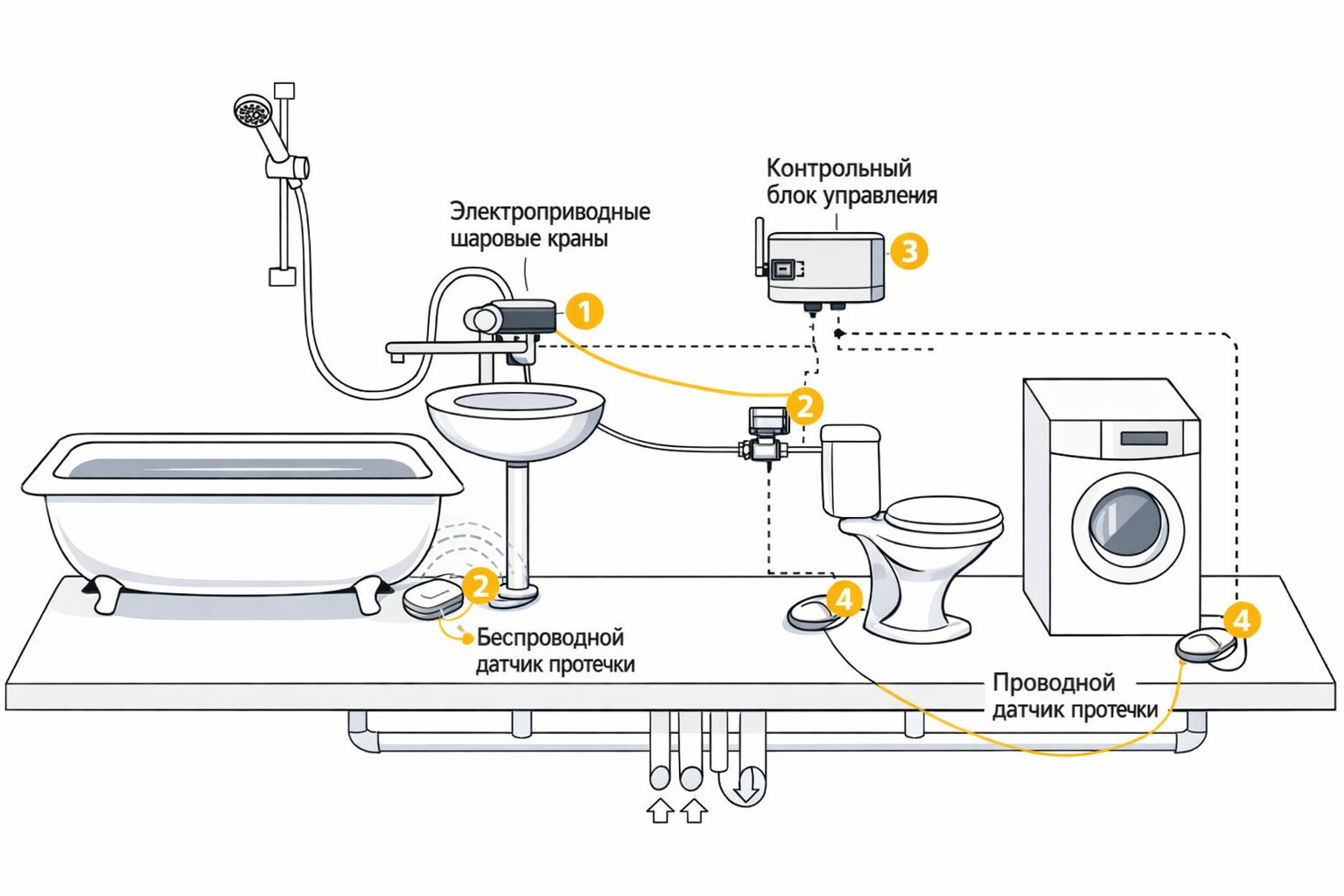 Даже в городской квартире актуальна тема защиты от протечек воды. Система от протечек включает датчики, контроллер и электроприводные шаровые краны на вводе воды. При попадании воды на датчики контроллер подаёт сигнал, и краны автоматически перекрывают подачу холодной и горячей воды. Это защищает не только от аварийных прорывов, но и от «мелких» неприятностей — сорванного шланга, трещины в смесителе или протечки под раковиной. Для частного дома такие системы ставят на вводе в дом и в наиболее рискованных зонах: котельная, санузлы, кухня.